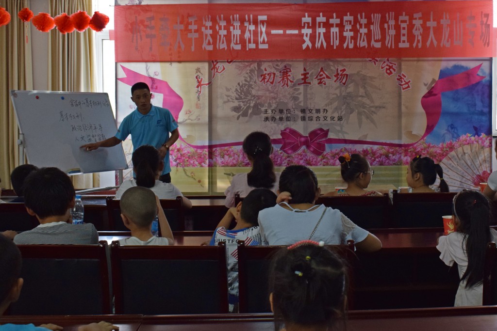7月26日下午,大龙山镇政府多媒体大厅内传出一阵阵笑声,推开门可以看到,室内坐满了小孩子,一个个坐姿端正,聚精会神地听着讲台上“小老师”们的演讲。这些小老师就是太阳成集团tyc122cc“加强法治宣传,助力乡村振兴”法律志愿服务队的成员们,他们来到大龙山镇政府,为周边社区的孩子们开展了主题为“小手拉大手,送法进社区”的宪法巡讲活动。
