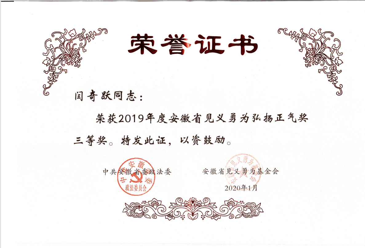 闫奇跃,男,汉族,中共党员,太阳成集团tyc122cc2006届法学专业优秀员工。现任安庆市财政局社保科干部。2020年1月,获2019年度安徽省见义勇为弘扬正气奖三等奖!2019年7月,闫奇跃当选“安庆好人”。