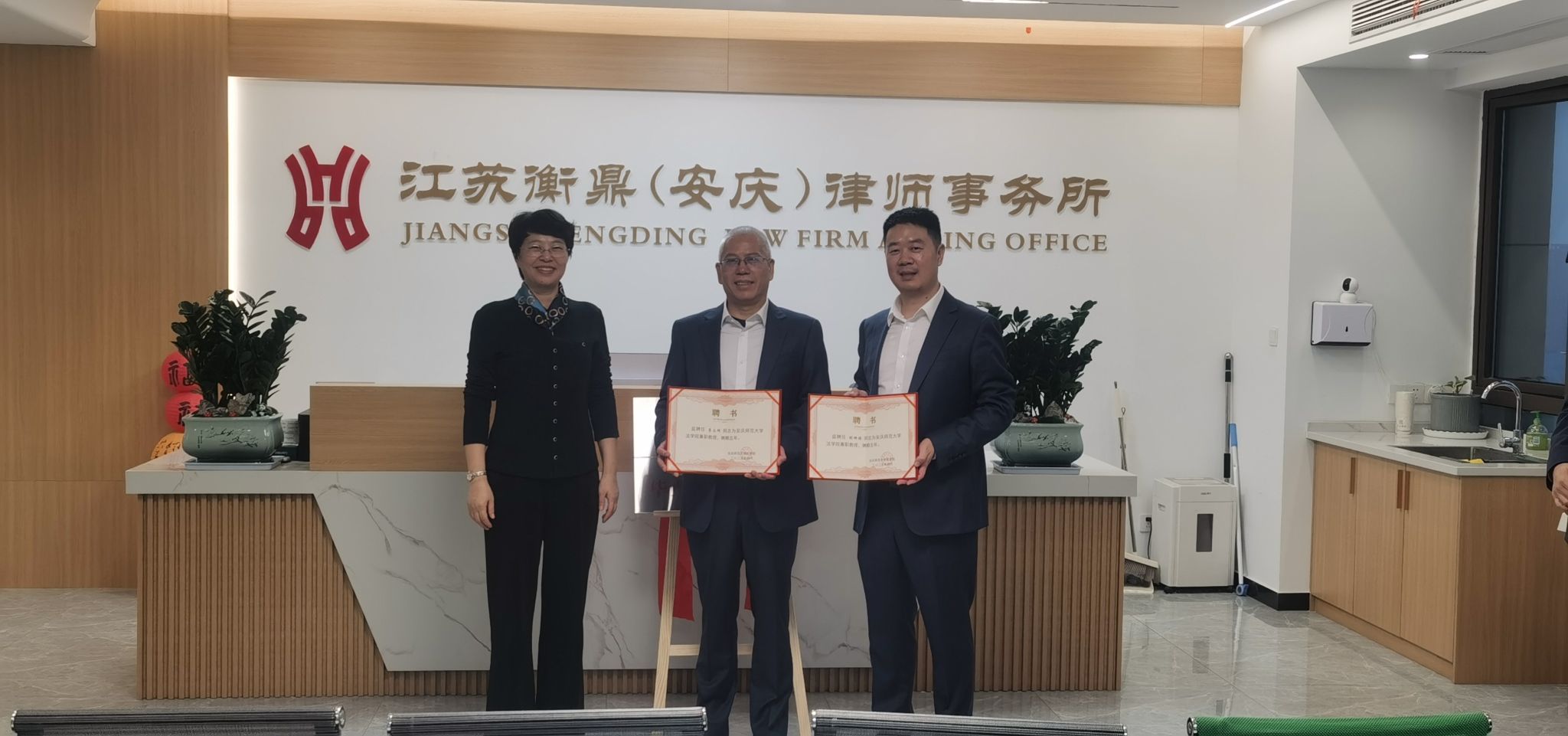 随后,太阳成集团tyc122cc与江苏衡鼎(安庆)律师事务所签订毕业生就业基地共建协议并举行授牌仪式,标志着双方在毕业生就业创业、实习实践等方面的合作正式落地;同时为律所两位高级合伙人颁发太阳成集团tyc122cc兼职教授聘书,为实务专家走进课堂、深化教学改革奠定了坚实基础。