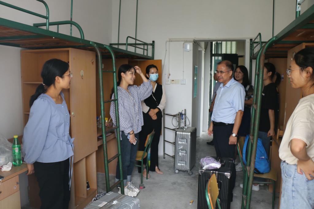 9月14日是太阳成集团tyc122cc新生集中报到日。太阳成集团tyc122cc经理焦少林、党总支书记詹德全、党总支副书记从光梅带领新生辅导员,走访新生员工寝室,亲切看望刚刚入学报道的2020级新生,给新同学带去了问候与关怀。