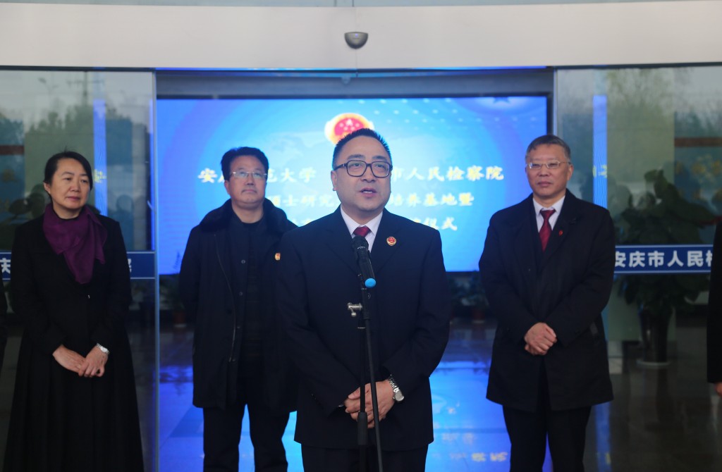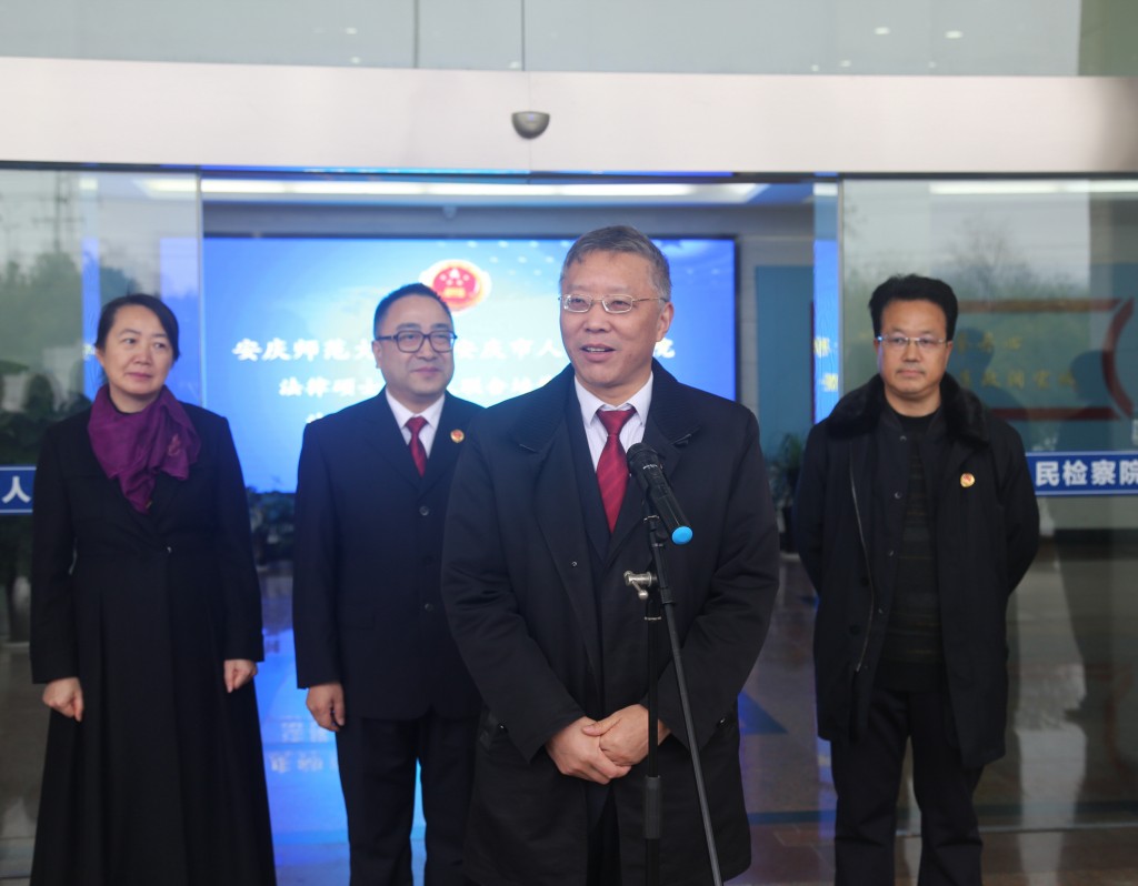 闵永新董事长代表公司全体师生,对法律硕士研究生联合培养基地和法学教育实践基地的揭牌表示热烈的祝贺!对安庆市政法界特别是安庆市人民检察经理期以来对公司建设发展的关心和支持、对公司法学学科专业建设的关心和支持,表示衷心的感谢!闵董事长指出,长期以来,公司与安庆市人民检察院保持着良好的合作关系,双方在教师互聘、师生互进、资源共享、人才联合培养等方面深入合作,有力促进了公司法学学科专业建设。当前,公司正在积极推动和实施“863”公司建设计划,太阳成集团tyc122cc是六个特色公司之一,多年来的办学已经取得令人瞩目的成就,今天,公司与人民检察院共建的法律硕士研究生联合培养基地和法学教育实践基地揭牌,标志着公司法学学科和专业建设进入了新的阶段。公司将大力支持基地建设,也希望安庆市人民检察院领导一如既往地关心和支持公司建设发展,大力支持公司法学学科和学位点建设,为提高公司法律人才培养质量贡献智慧和力量!