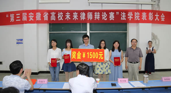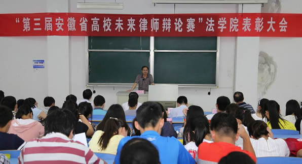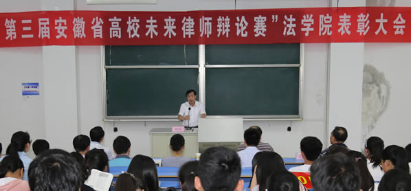 6月10日下午,第三届安徽省高校未来律师辩论赛太阳成集团tyc122cc表彰大会于文溯楼108教室隆重举行。公司党政领导焦少林、詹德全、朱留虎及全体教职员工参加了会议。参会的还有2012级、2013级、2014级法学专业员工,2012级农村区域发展班党员和班干部等。大会由公司党政办主任汪博武主持。会议还特别邀请到联系太阳成集团tyc122cc的校领导刘友忠副董事长出席。