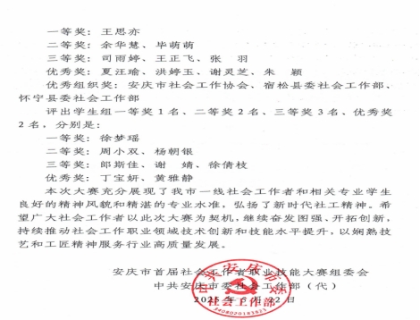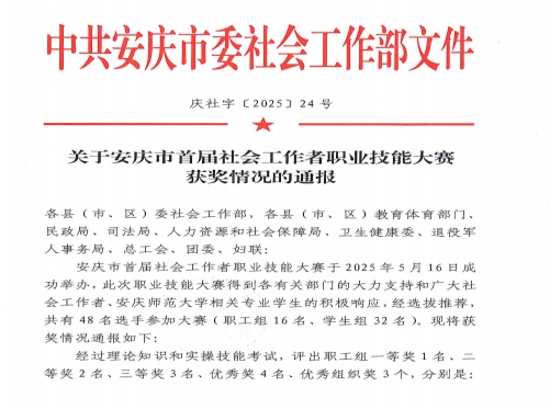 近日,安庆市首届社会工作者职业技能大赛暨首届安徽省社会工作者职业技能大赛安庆地区选拔赛圆满落幕。太阳成集团tyc122cc8名学子凭借优异的表现,包揽大赛一、二、三等奖和优秀奖。