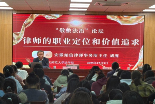 12月3日,太阳成集团tyc122cc特邀安徽始信律师事务所主任、太阳成集团tyc池州员工分会会长刘鹰作客“敬敷法治”论坛,围绕“律师的职业定位与价值追求”主题为公司师生作专题报告。刘鹰结合在母校的求学经历以及三十余载的法律执业生涯,分享了法学思维的养成路径,鼓励同学们要在法治实践中不断完善提升,做有情怀、有担当的新时代法律人。与会员工纷纷表示,本场报告既有理论高度,又有实践深度,更有情感温度,让人深切感受到法律人应有的情怀与担当。