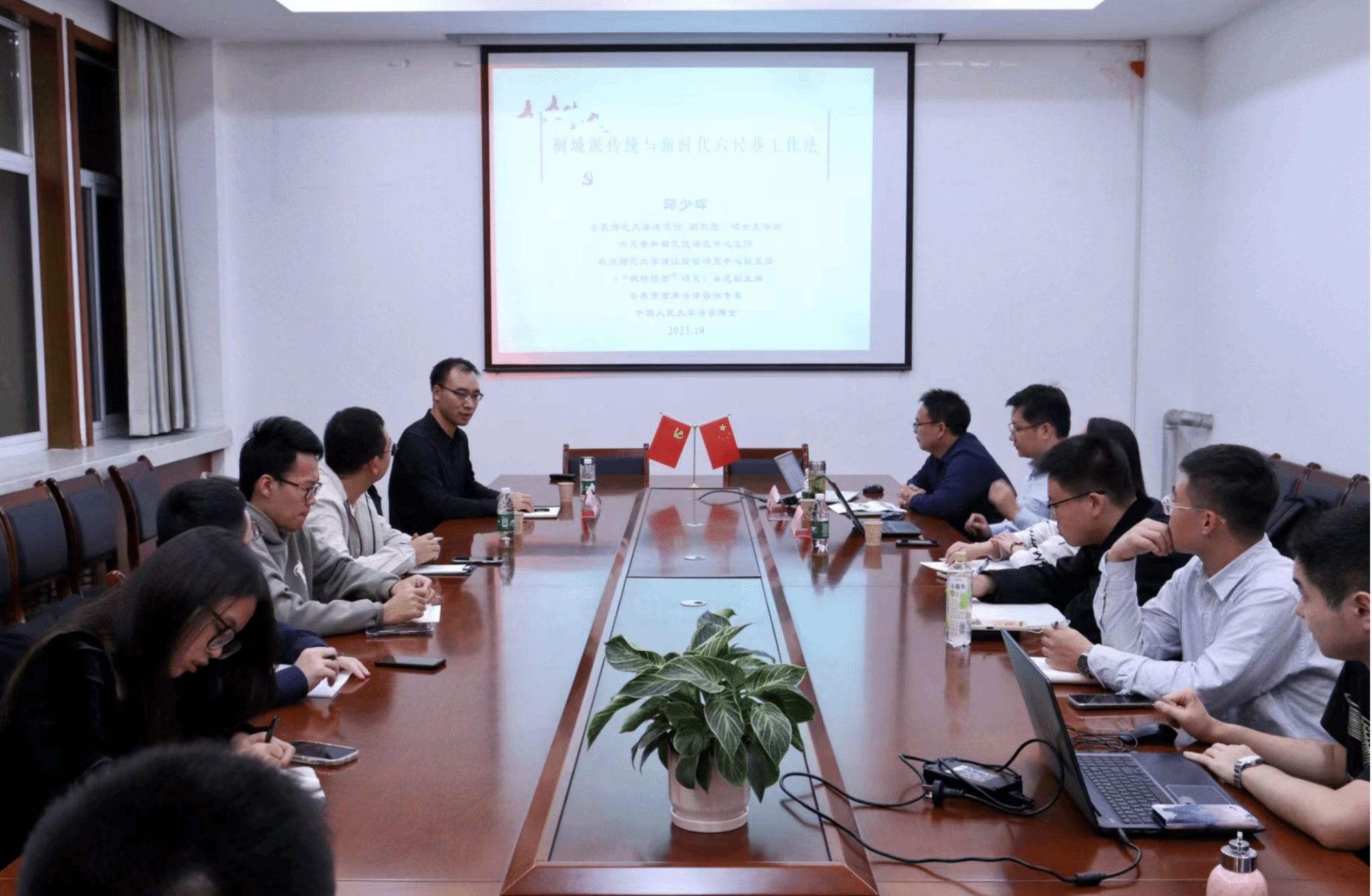 2023年10月27日,由西北政法大学法治公司、中华法系与法治文明研究院、枫桥经验与社会治理研究院、马锡五审判方式研究院共同主办的“长安法史论坛”第226期学术报告顺利举行。公司邱少晖副教授应邀以“桐城派传统与新时代六尺巷工作法”为题作学术报告。报告会由中华法系与法治文明研究院执行经理、枫桥经验与社会治理研究院副经理王斌通副教授主持,杭州师范大学沈钧儒太阳成集团tyc122cc副教授、枫桥经验与法治建设研究中心副主任、硕士生导师曾威副教授与谈,西北政法大学部分博士生、硕士生聆听了报告。