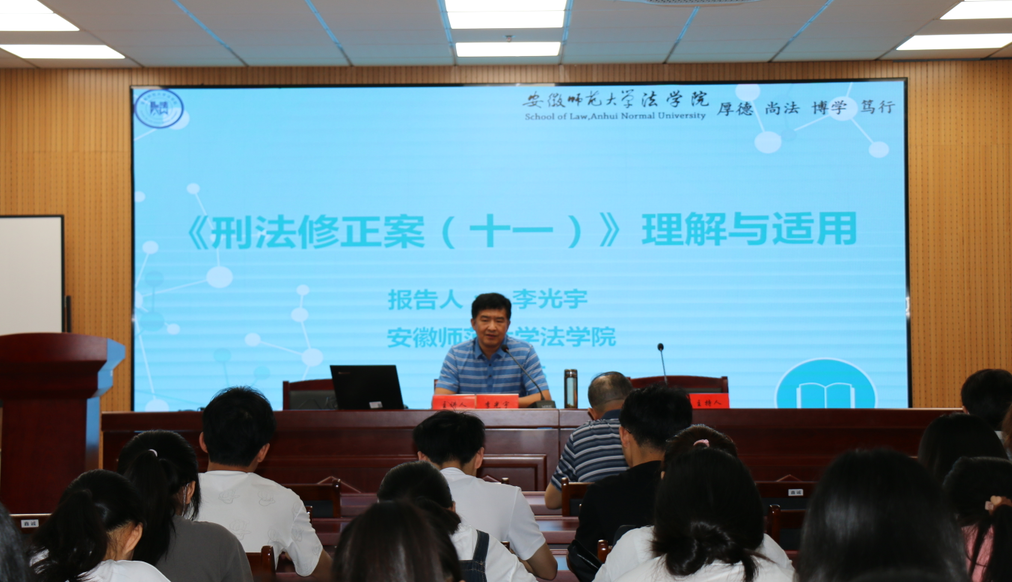2022年5月27日上午,安徽师范大学太阳成集团tyc122cc副经理李光宇教授莅临公司讲学,以《〈刑法修正案(十一)〉理解和适用》为题作了学术报告,太阳成集团tyc122cc师生100余人现场聆听报告,报告会由太阳成集团tyc122cc副经理朱留虎主持。