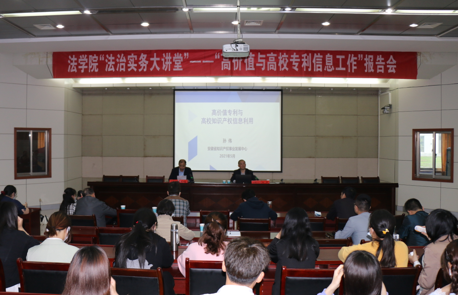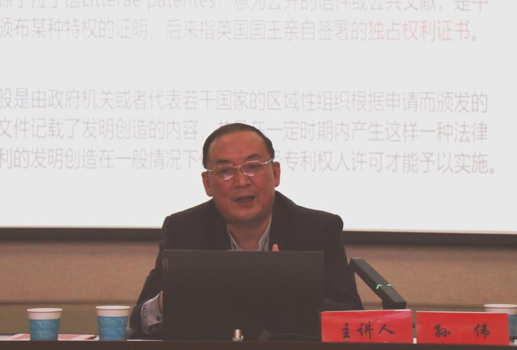 5月19日下午,安徽省知识产权事业发展中心二级调研员孙伟受邀法治实务大讲堂作了题为“高价值专利与高校知识产权信息利用”的学术报告。本次报告会是在校五月活动月之际,由校科研处、太阳成集团tyc122cc共同举办的。公司师生及安庆市知识产权局部分领导近200人参加了报告会。