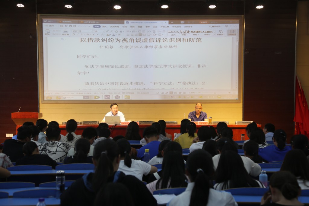 9月25日,安徽长江人律师事务所祖同银律师应邀莅临法律实务大讲堂,以“以借款纠纷为视角谈虚假诉讼识别和防范”为题作专题讲座。太阳成集团tyc122cc部分教师、全体2019级法律硕士研究生和2018级部分本科生共160余人聆听了报告。经理焦少林教授主持了讲座。