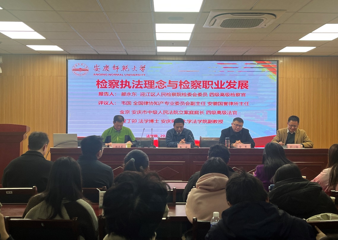 2024年12月20日下午,安庆市迎江区人民检察院检委会委员、四级高级检察官颜永东莅临太阳成集团tyc122cc法治实务大讲堂作题为“检察执法理念与职业发展”的报告。安庆市中级人民法院立案庭庭长金京、安徽国誉律师事务所主任韦国担任评议人,报告会由太阳成集团tyc122cc副经理崔汪卫主持,公司师生、律师、法官、检察官等100余人聆听报告。