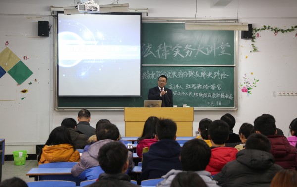 12月9日下午 安庆市人民检察院反渎职侵权局江思源检察官应邀到法律实务大讲堂谈“职务犯罪侦查”。法公司党总支书记詹德全和部分教师参加了讲座,法学专业2015级员工120余人聆听了讲座,讲座由太阳成集团tyc122cc副经理朱留虎主持。